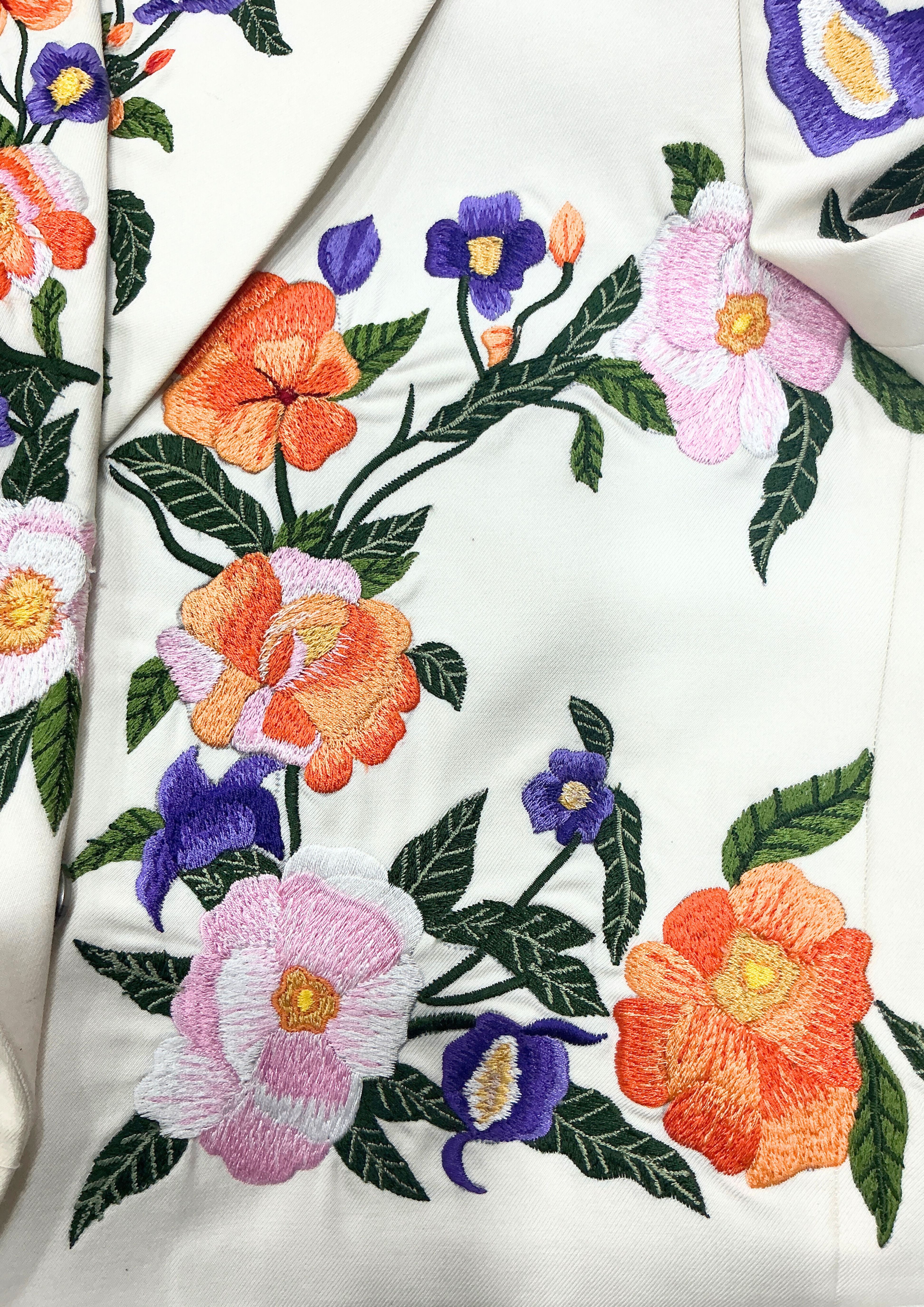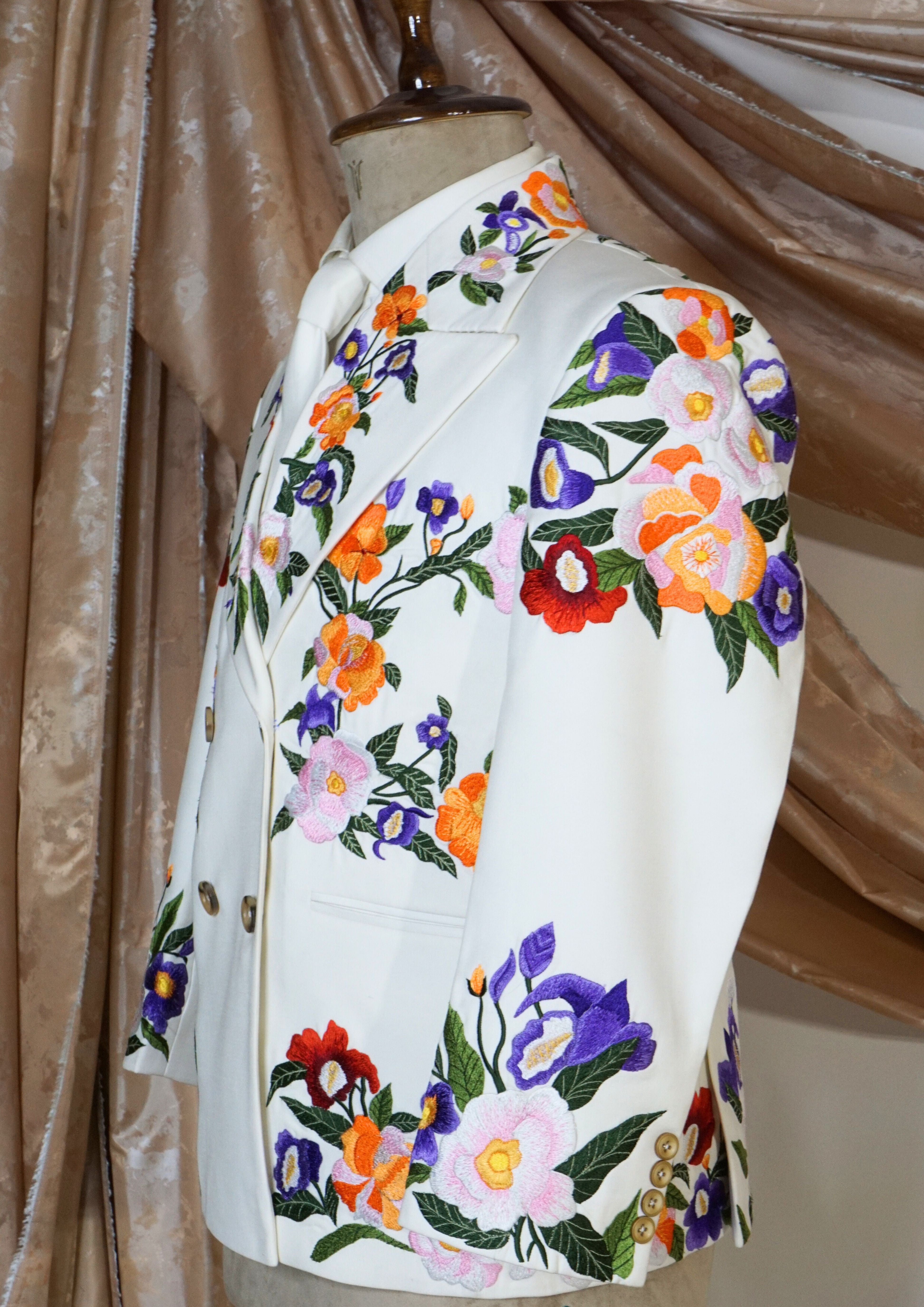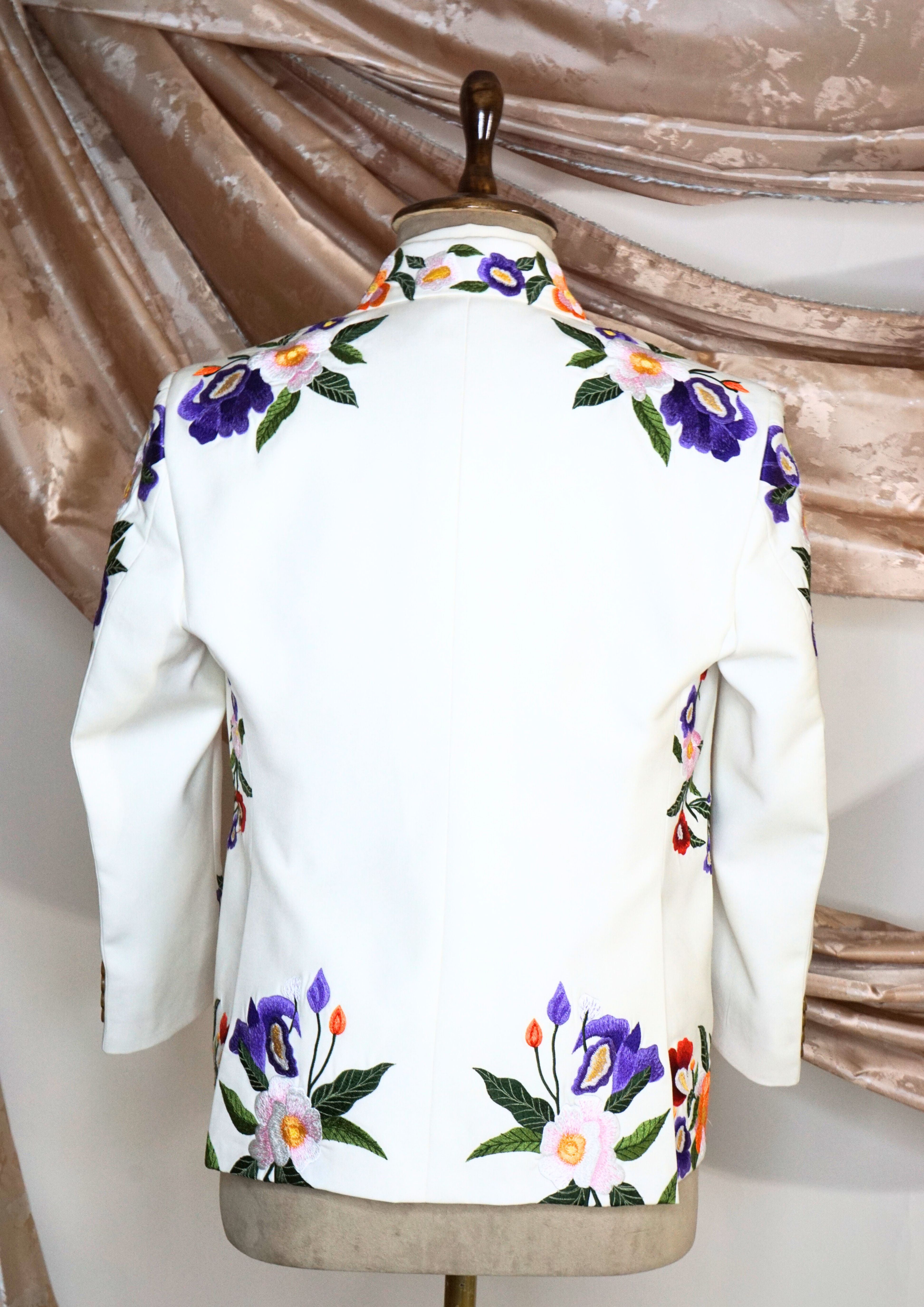 The crisp white base provides a clean, luminous foundation, while delicate floral embroidery adds texture, depth, and visual intrigue. Each motif is meticulously crafted to highlight the structured silhouette, reflecting expert craftsmanship and attention to detail. The result is a polished, couture-quality finish that elevates traditional Western wear into a statement piece.