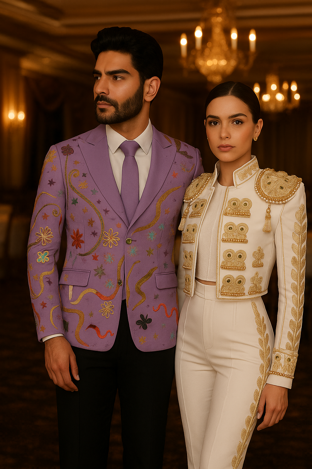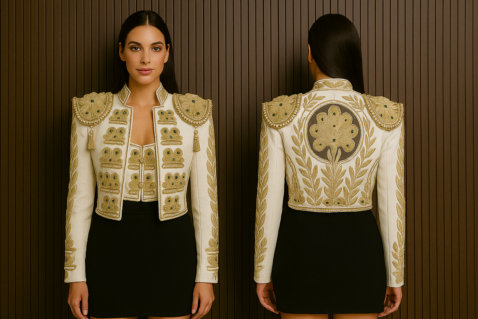Own the spotlight with the Golden Conquest set a dazzling ode to heritage opulence and empowered femininity. This structured ivory cropped jacket, inspired by the ornate uniforms of Spanish toreros, is embroidered to perfection with golden threadwork, regal shoulder epaulettes, and emerald-accented detailing.