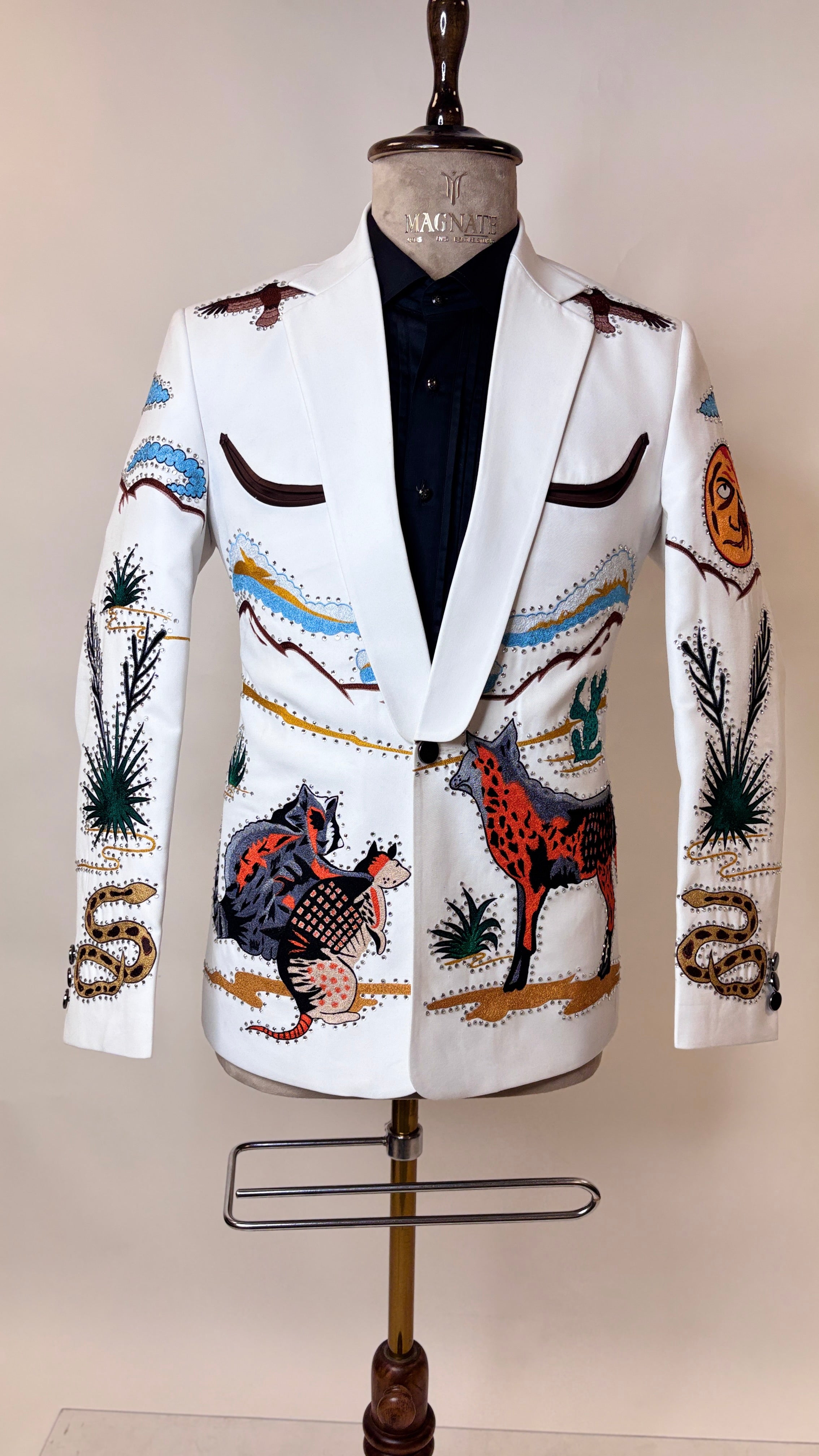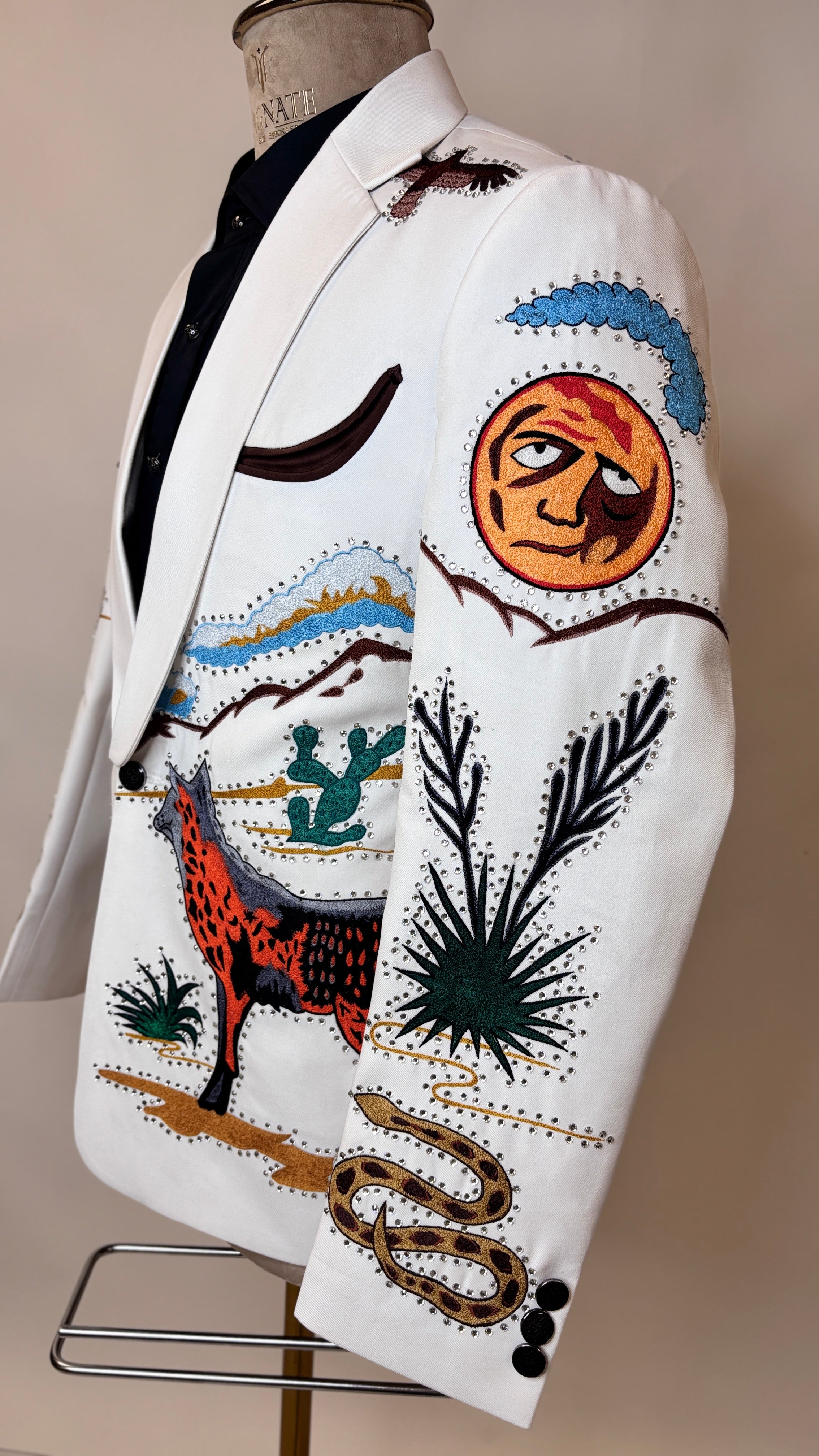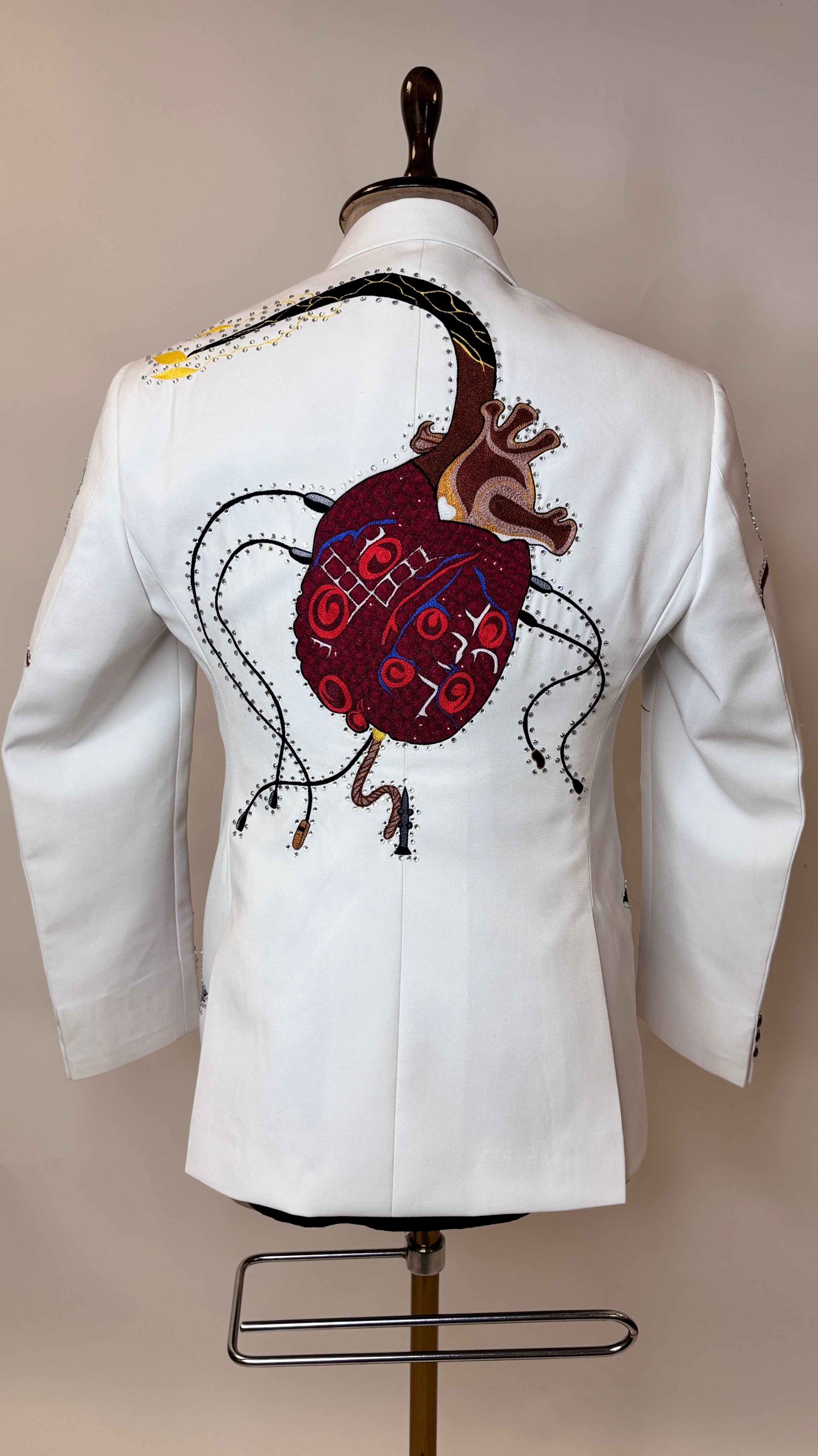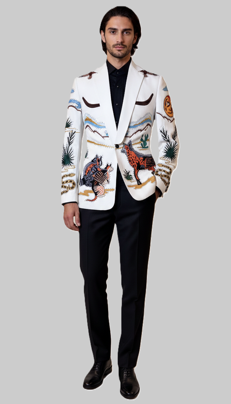 The soft white hue provides a fresh, sophisticated base, elevating the outfit beyond traditional Western tones. Intricate heart embroidery takes center stage, symbolizing strength, freedom, and daring elegance. Each embroidered detail is carefully positioned to enhance the tailored silhouette, adding texture, visual interest, and couture-level artistry while maintaining a sharp, masculine profile.