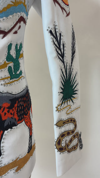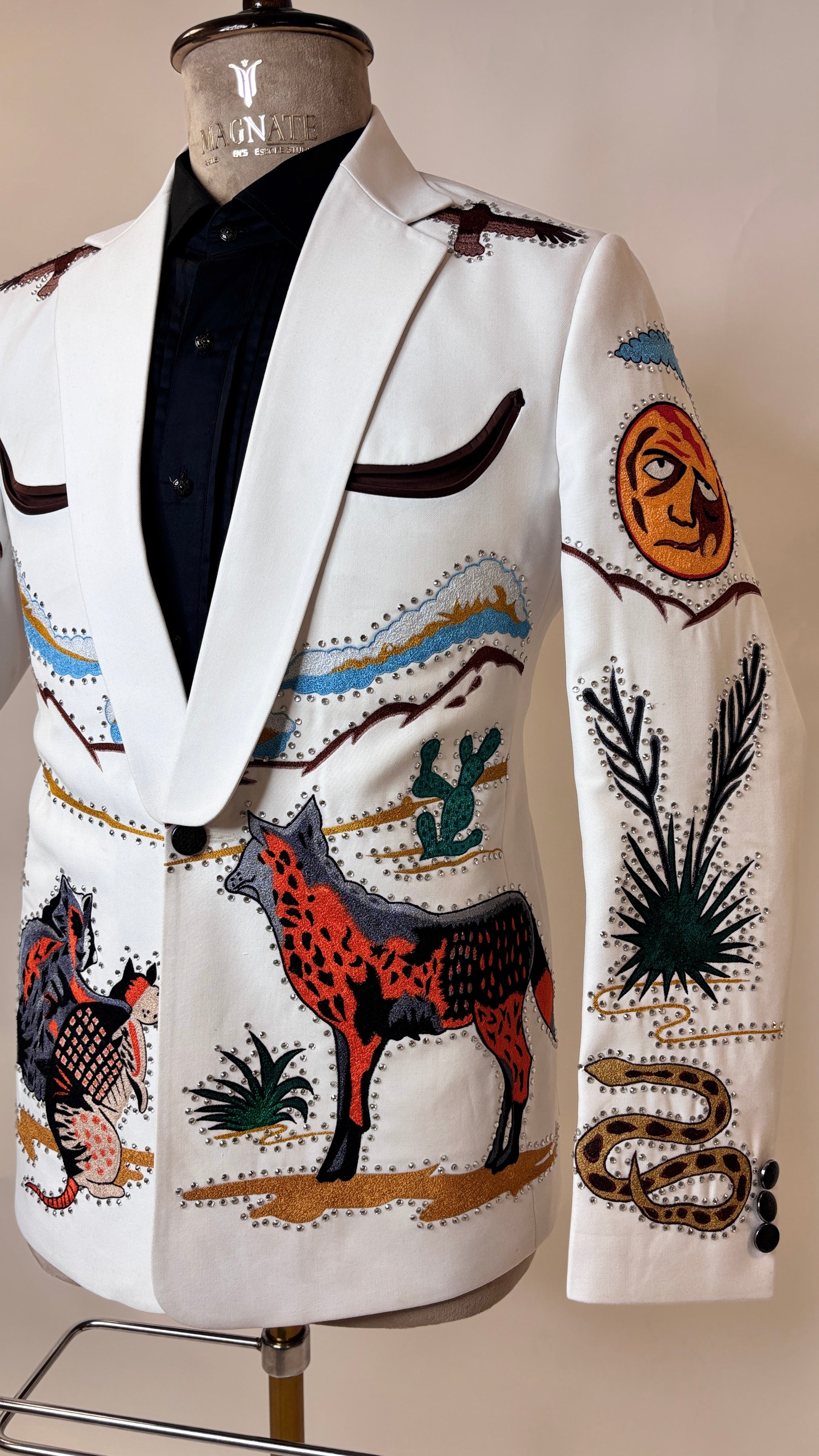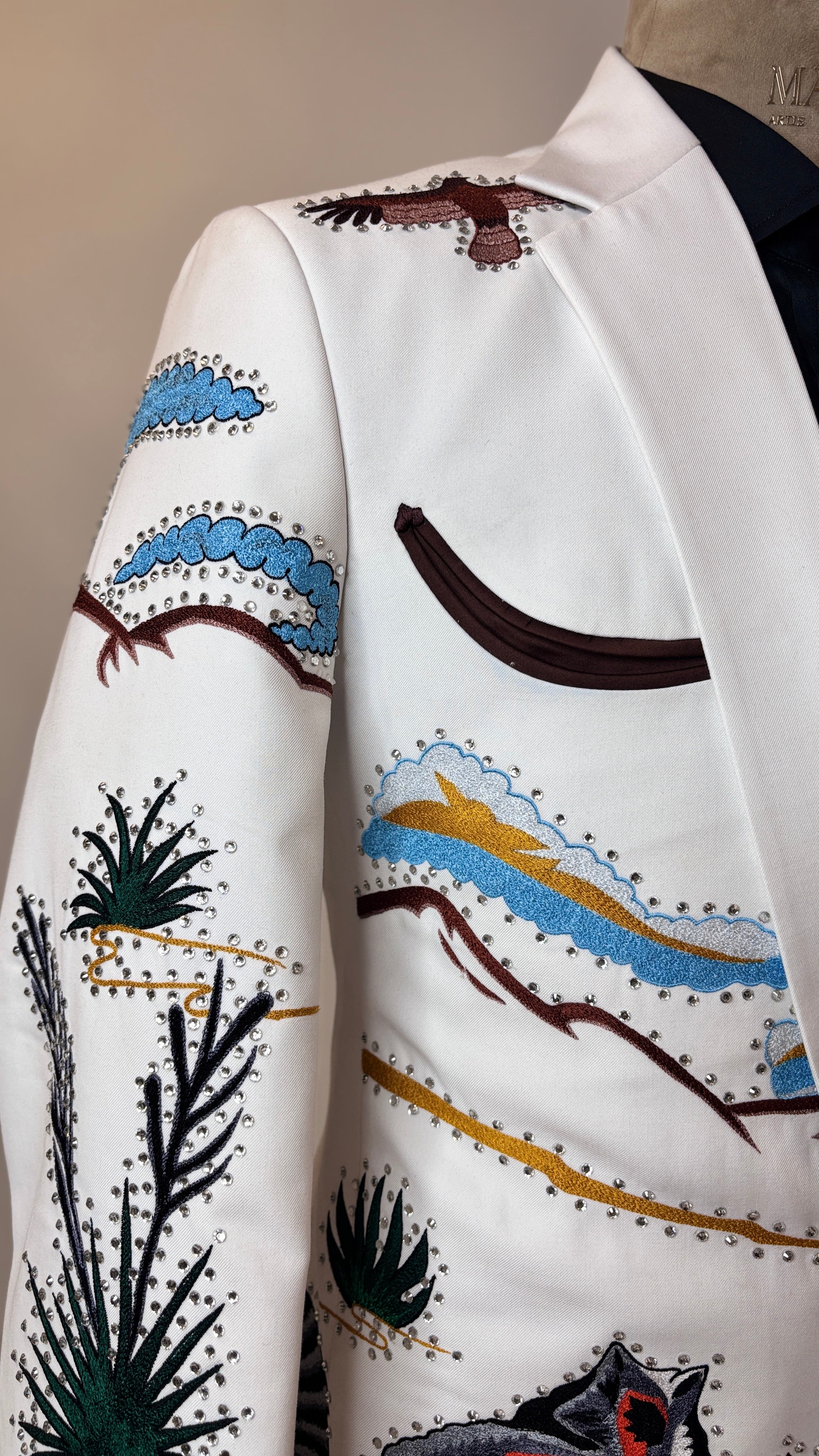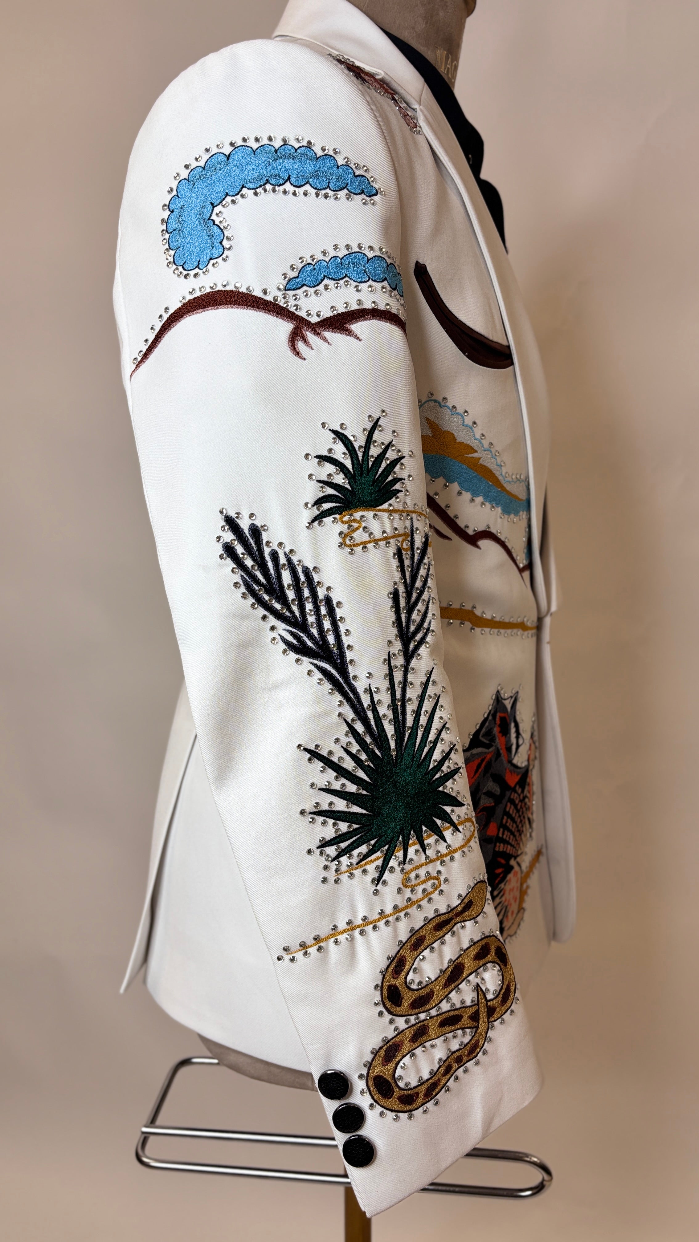 The soft white hue provides a fresh, sophisticated base, elevating the outfit beyond traditional Western tones. Intricate heart embroidery takes center stage, symbolizing strength, freedom, and daring elegance. Each embroidered detail is carefully positioned to enhance the tailored silhouette, adding texture, visual interest, and couture-level artistry while maintaining a sharp, masculine profile.