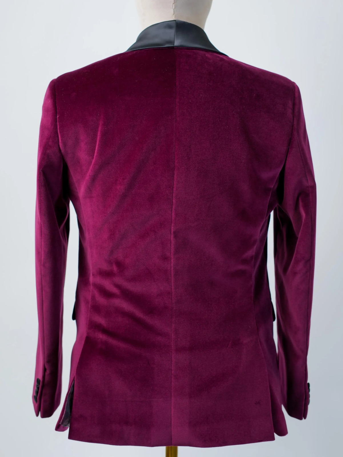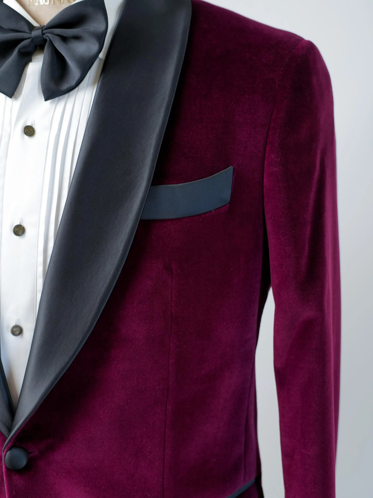 The centerpiece is the exquisitely tailored jacket, crafted from rich, luminous Bordeaux velvet. This deep, wine-red hue is instantly luxurious, setting a dramatic yet elegant tone. The velvet is beautifully contrasted by a sharp, satin-black shawl lapel, which provides the classic formality of a tuxedo. The jacket’s single-button closure and contoured silhouette ensure a powerful and flattering fit.
