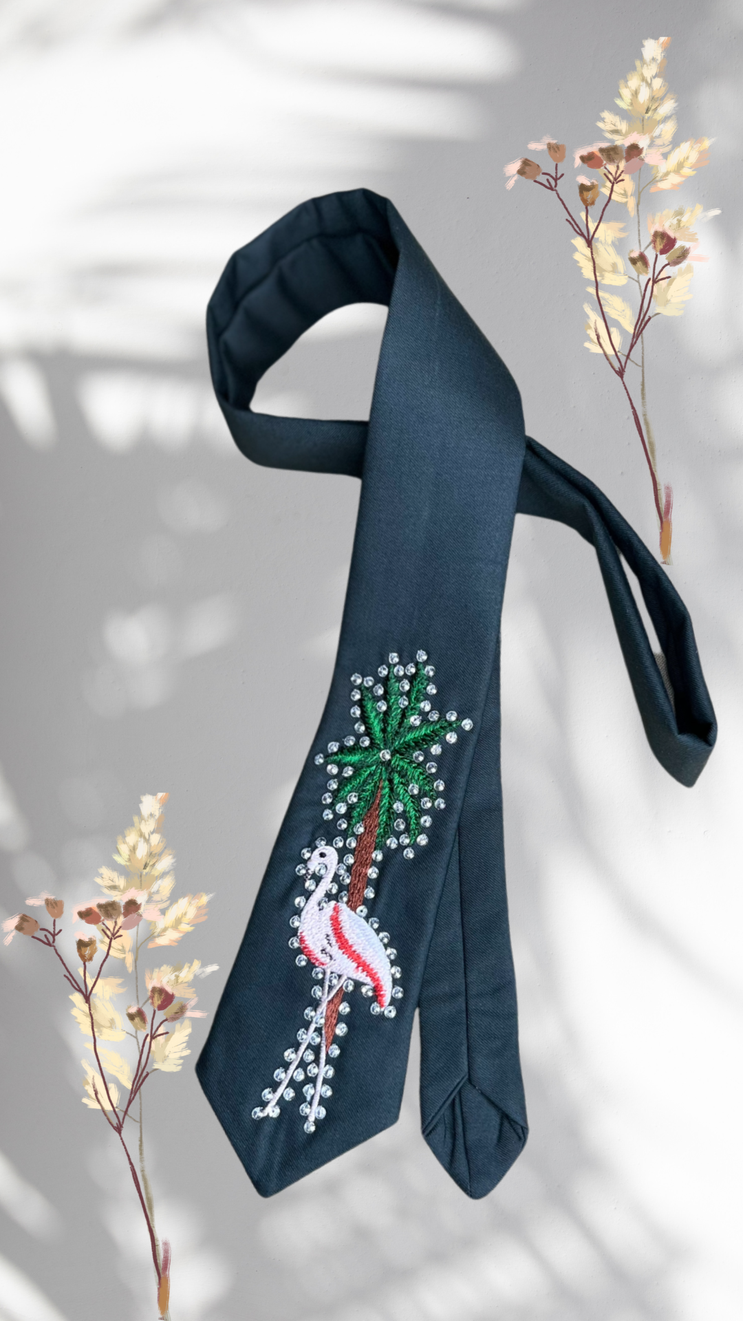 For a tie that is both unique and stylish, the Flamingo's Paradise tie is an exceptional choice. Against a sleek dark blue satin background, a beautifully embroidered flamingo stands beside a stylised palm tree. The flamingo's body is a soft pink and white, while the tree's fronds are a vibrant green, all outlined with a cascade of shimmering white and silver beads. This tie is a bold statement piece, perfect for the individual with a vibrant personality and a love for distinctive design.