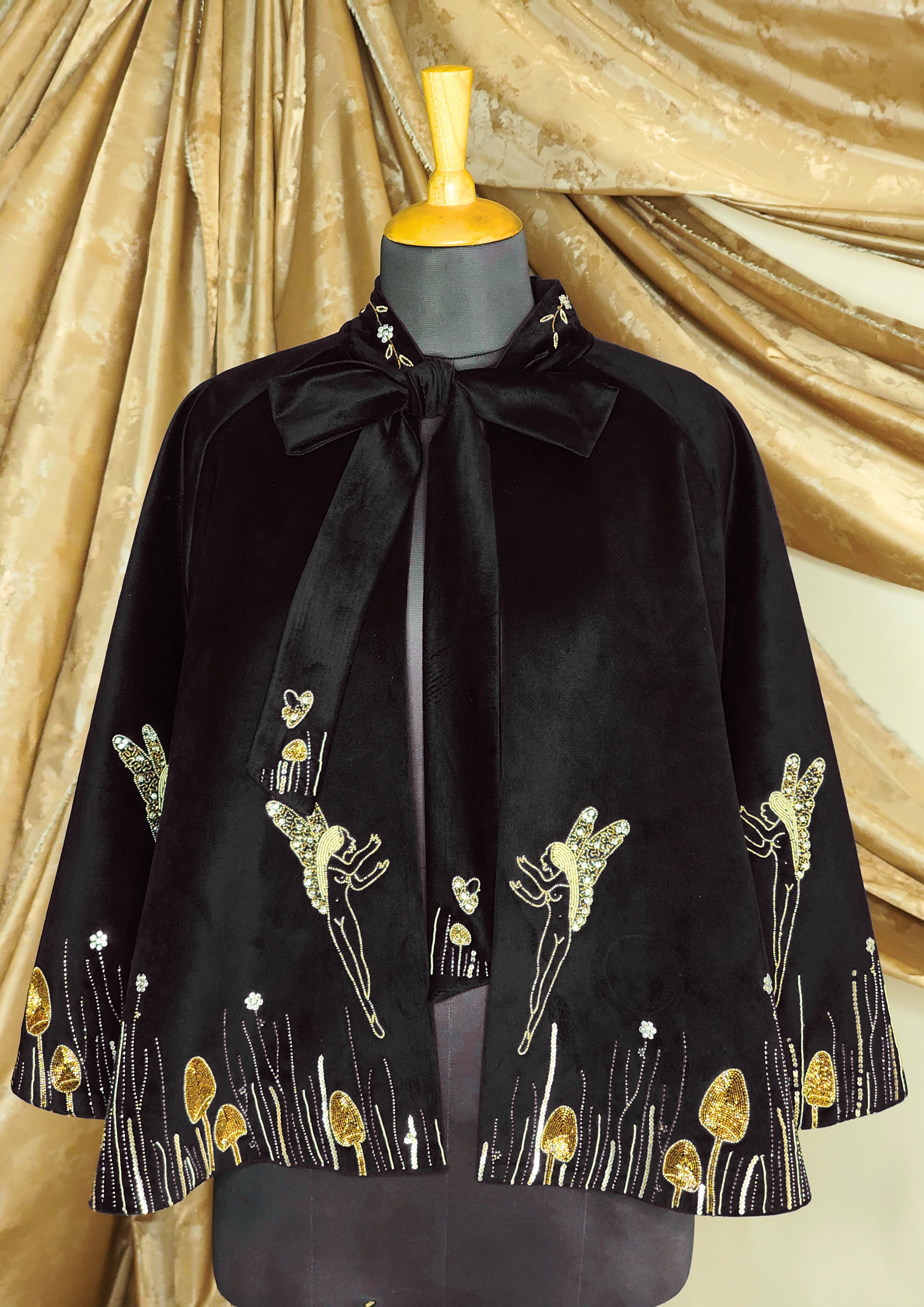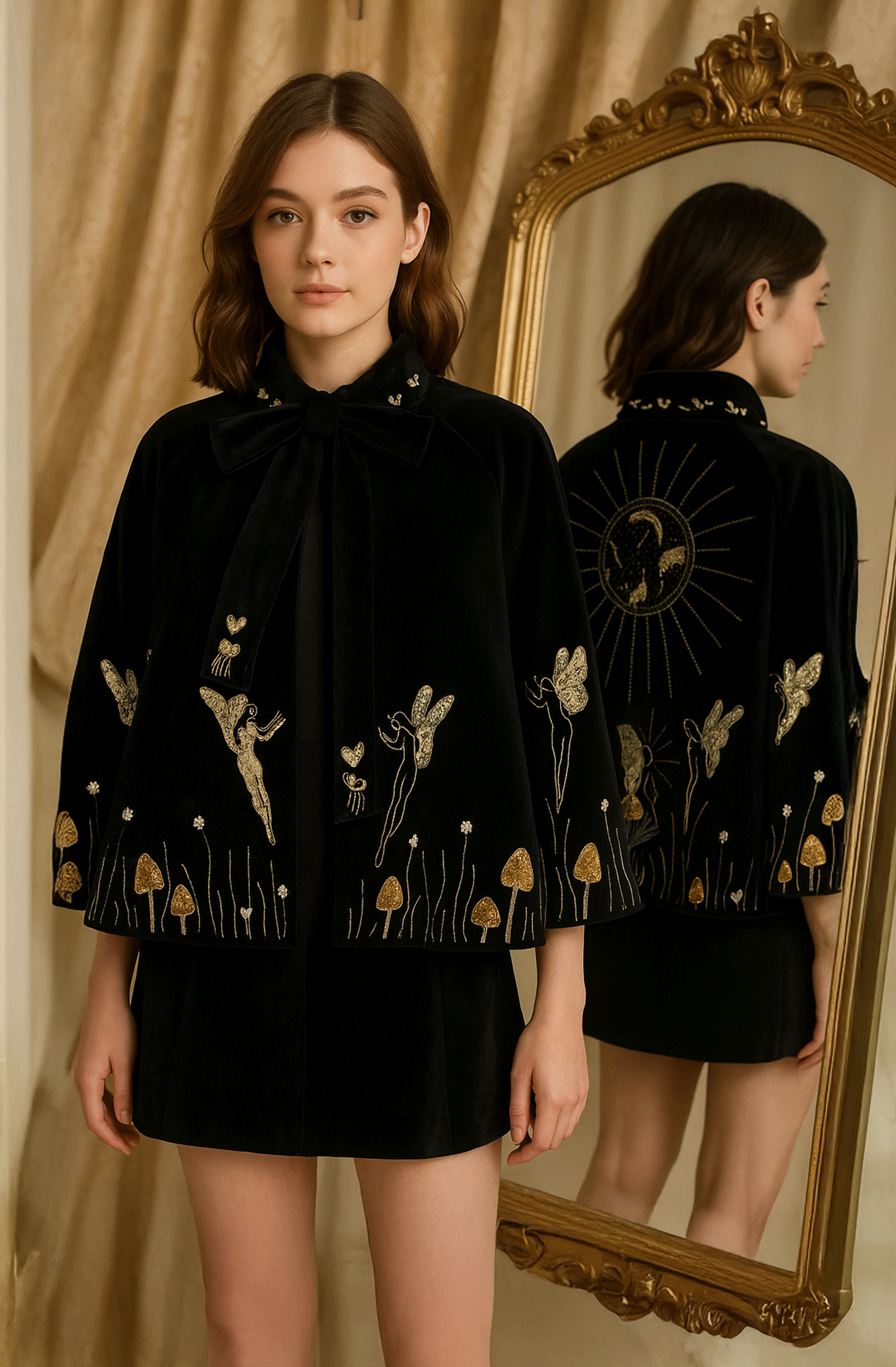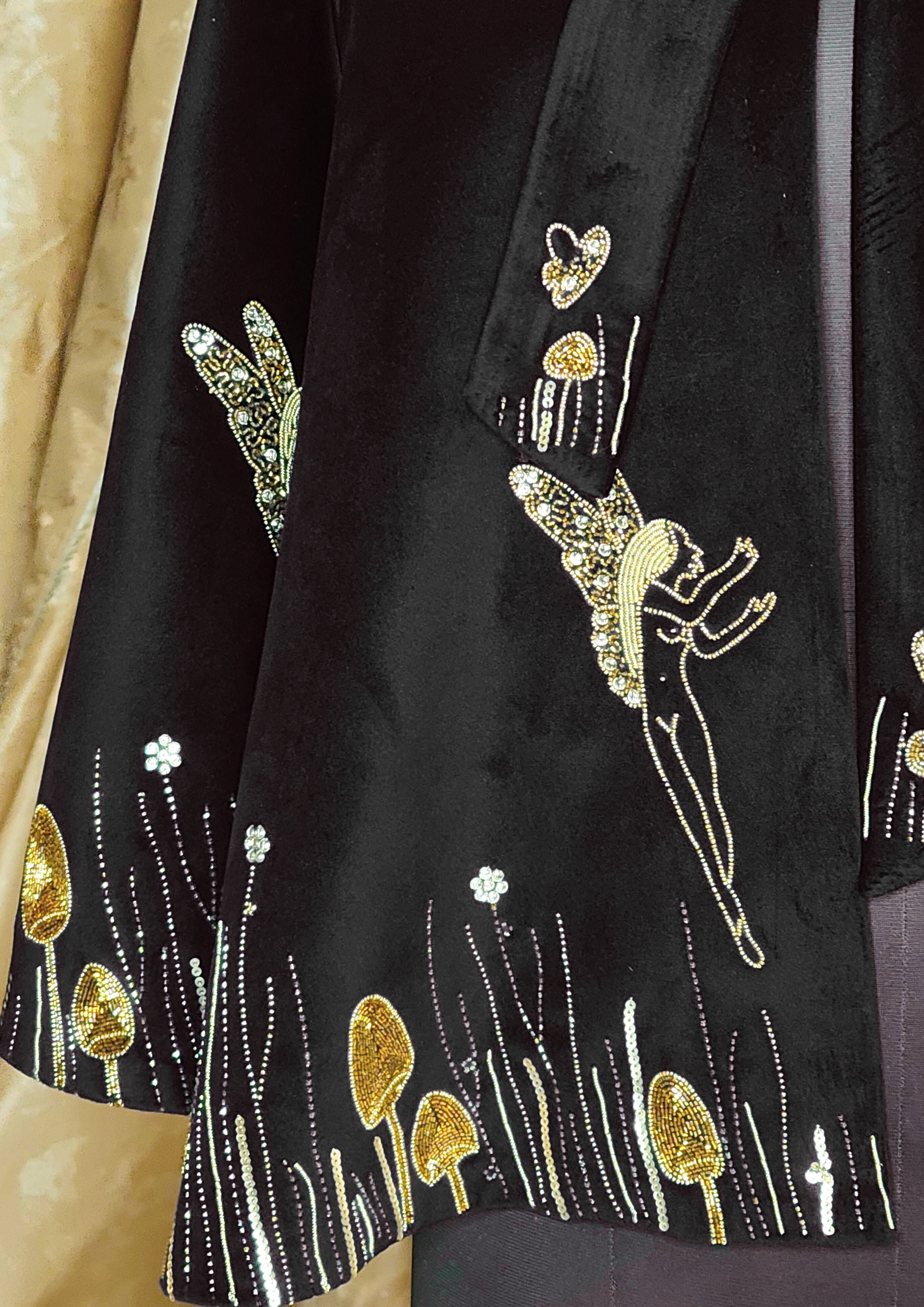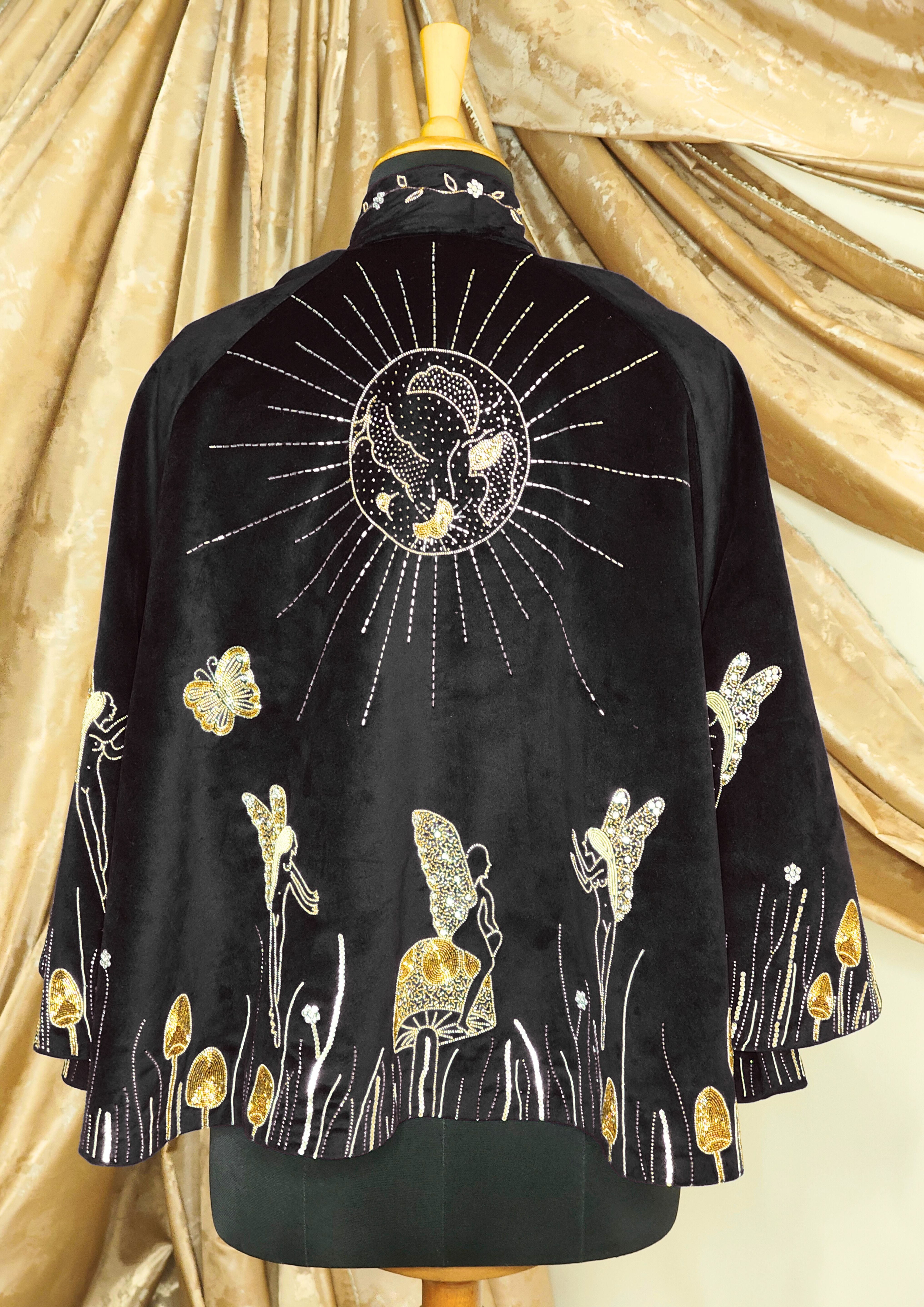 Hand-embroidered in shimmering gold and ivory, celestial sprites and winged figures dance among enchanted mushrooms, weaving a story of midnight gardens and hidden magic. The back reveals a radiant sunburst motif encircling a swan in flight—a symbol of grace, power, and eternal beauty.