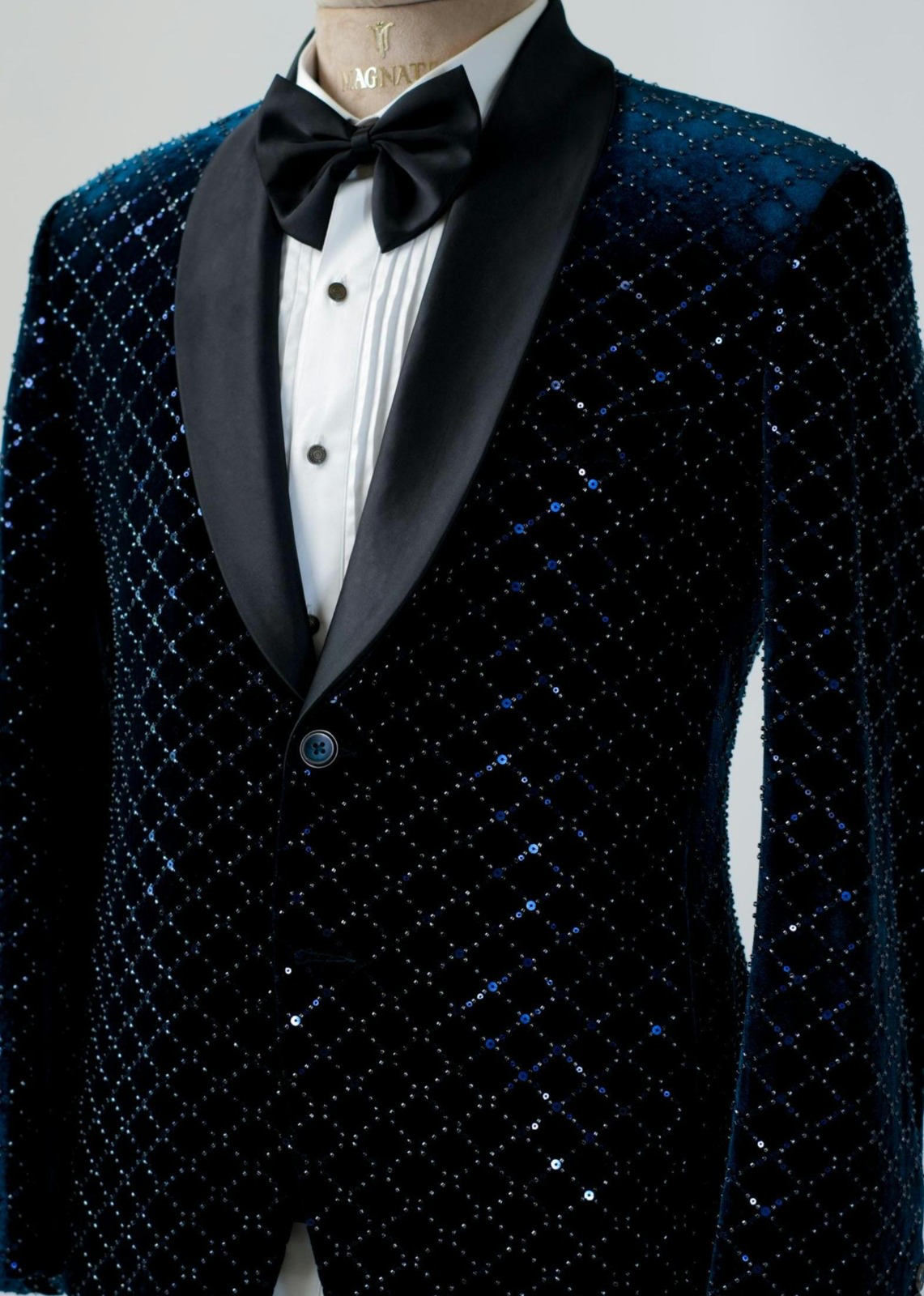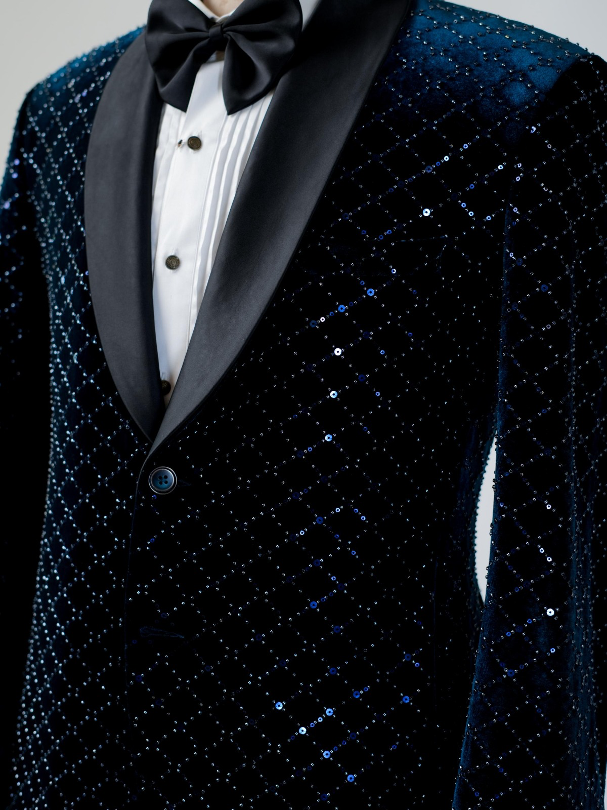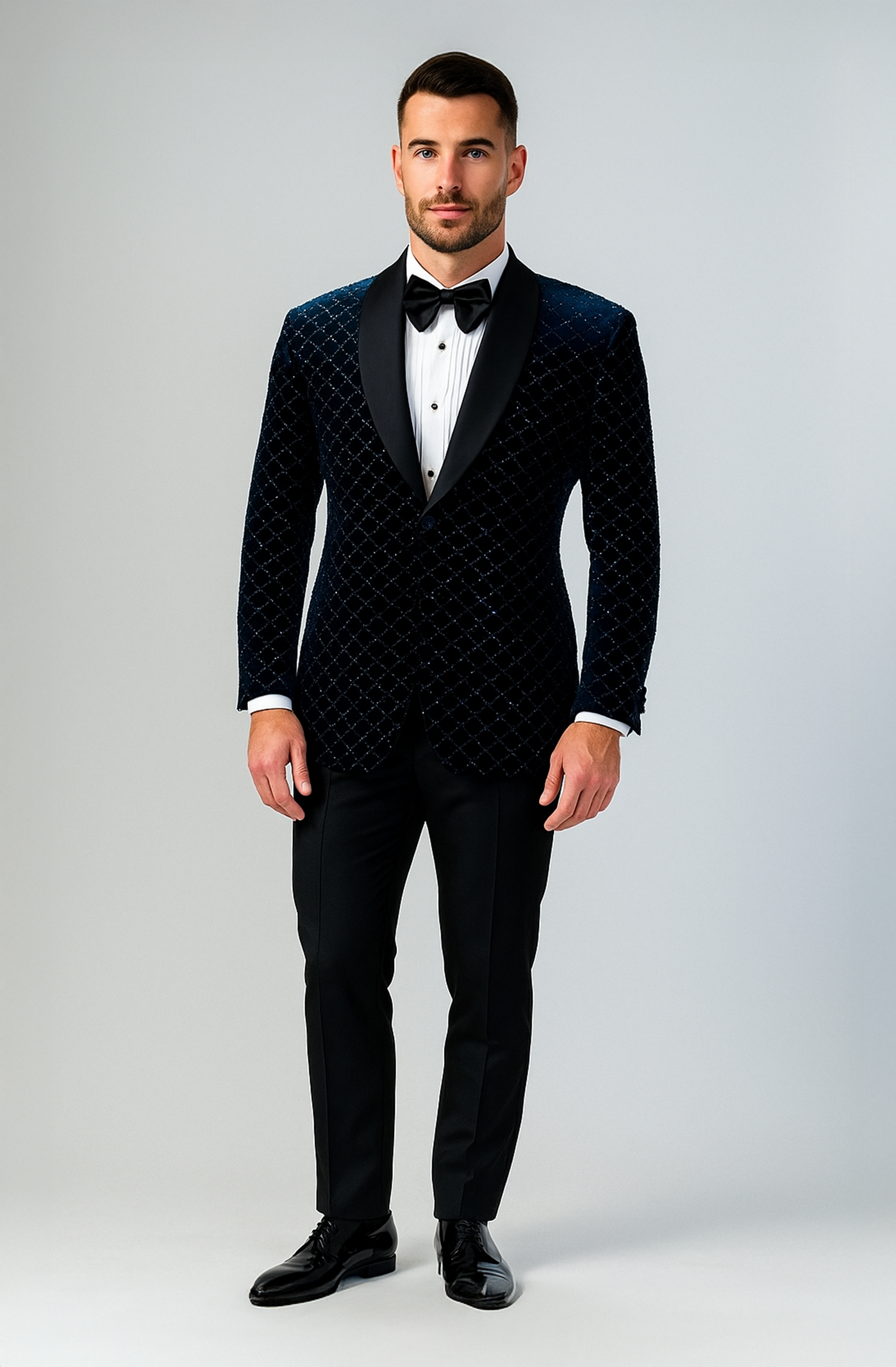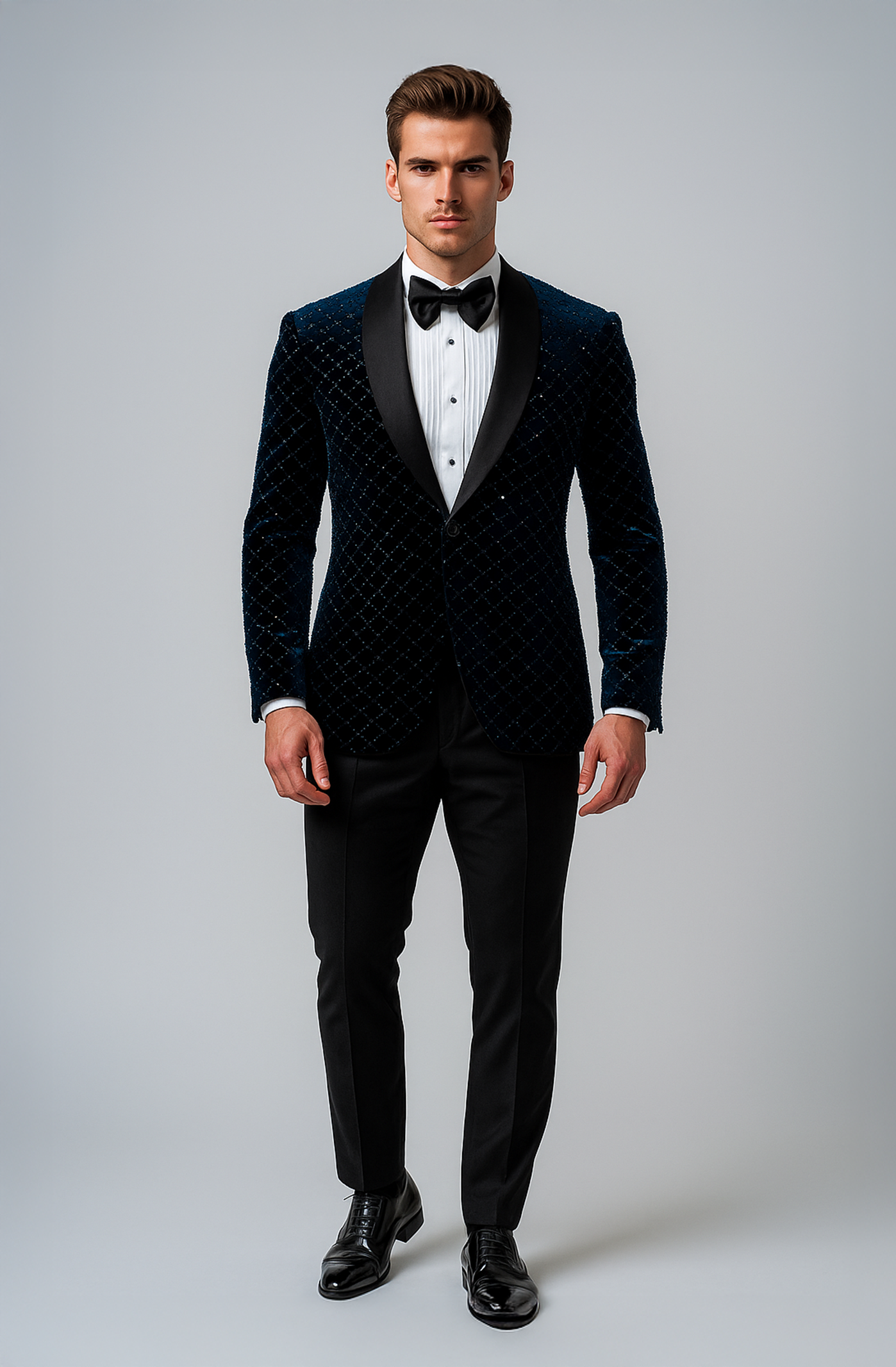 Crafted for the modern gentleman who commands presence, The Midnight Regal Tuxedo is a masterpiece of refined sophistication. Its deep midnight velvet jacket, patterned with subtle diamond texturing, evokes the quiet brilliance of a starlit sky—timeless yet contemporary.