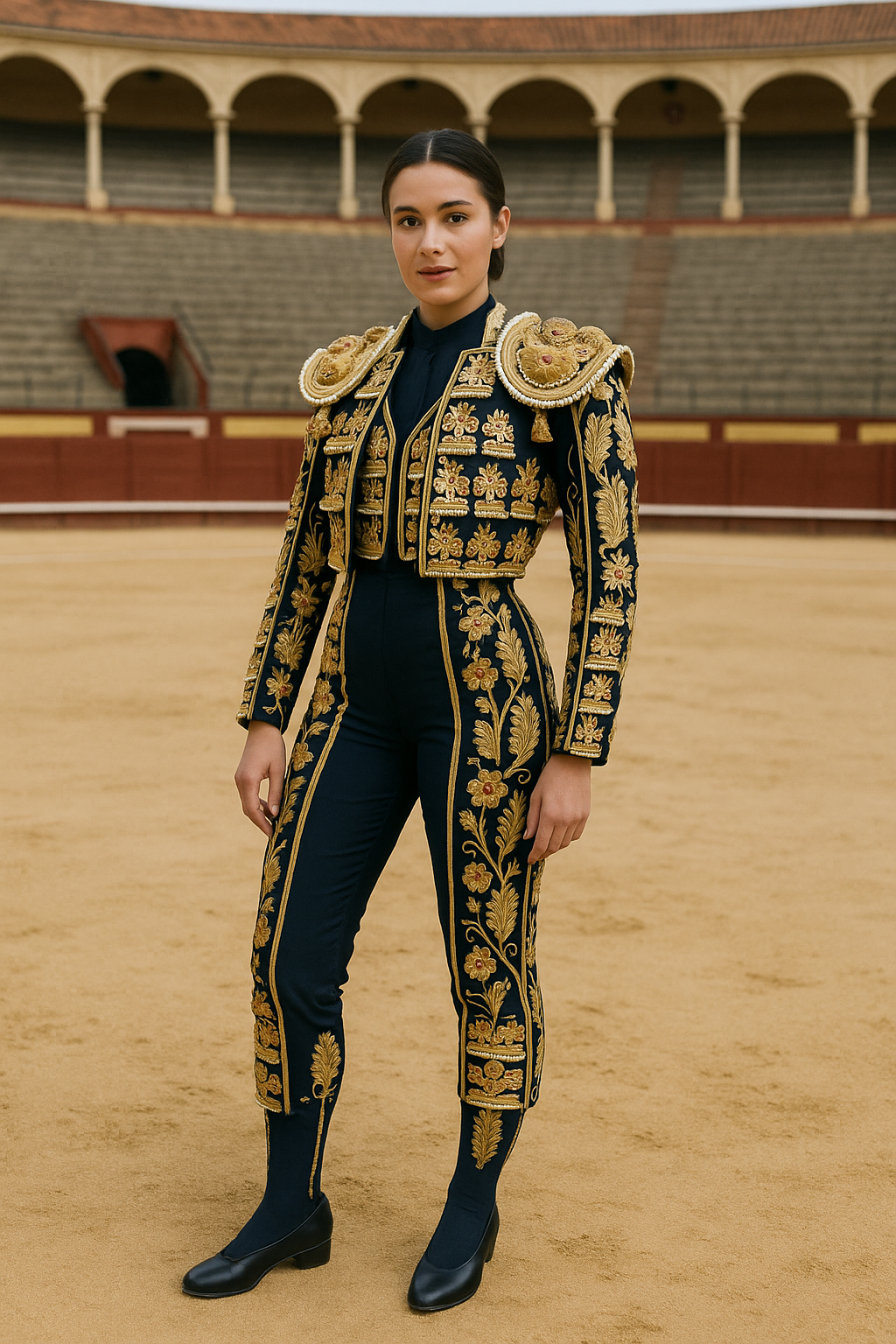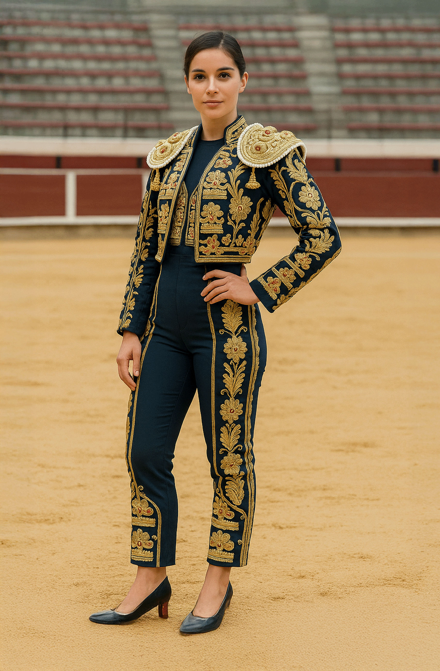 The cropped chaquetilla, adorned with ornate shoulder pads, frames the silhouette with bold precision, while the high-waisted trousers elongate and empower. Every detail—hand-stitched embroidery, refined tailoring, and opulent textures—celebrates strength expressed through grace. This is not just attire; it is heritage woven into wearable majesty.