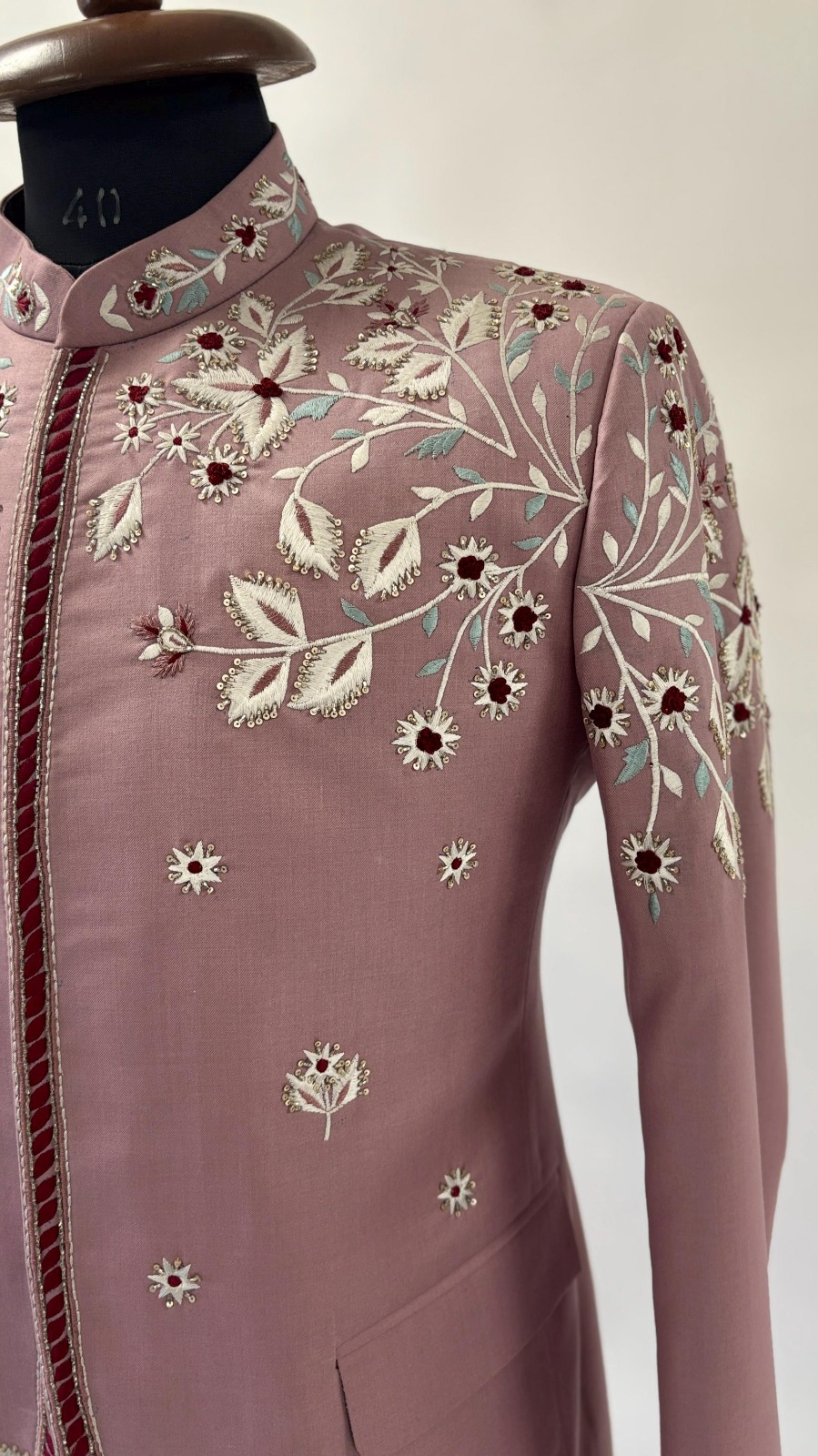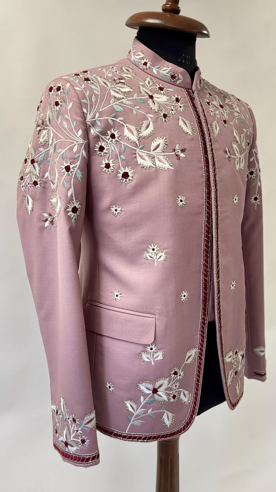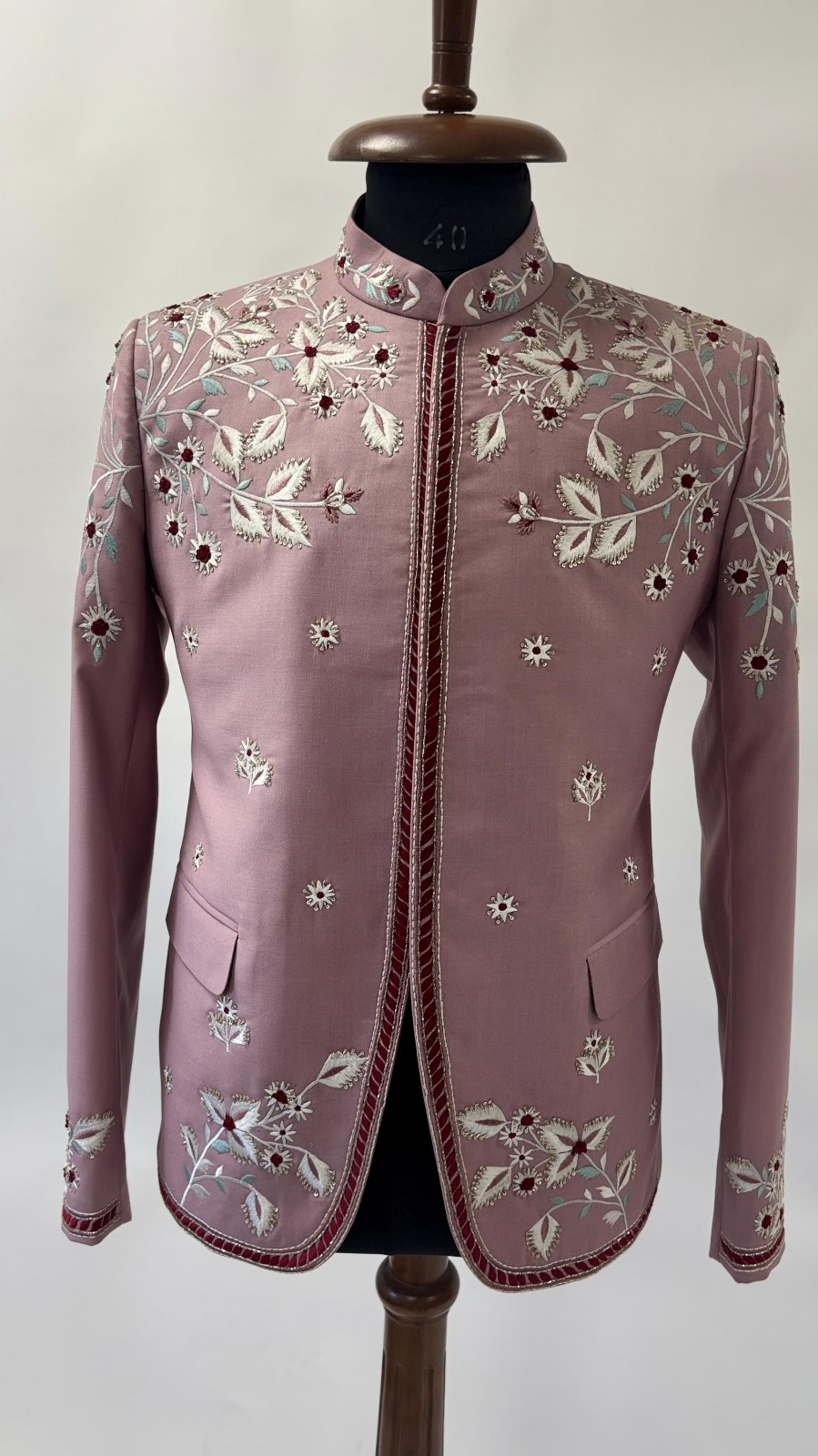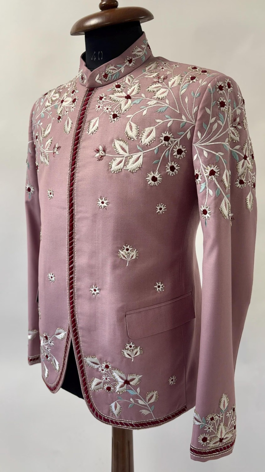 Crafted in a distinctive muted rose or mauve hue, the jacket offers a sophisticated departure from conventional formalwear. It is lavished with exquisite, all-over floral and vine embroidery in soft silver and white threads, creating a stunning contrast that evokes dew-kissed petals. Accents of deep burgundy embroidery punctuate the design, adding a striking depth to the delicate motif. The continuous, sweeping embroidery covers the entire garment, including the mandarin collar and the curved hemline.