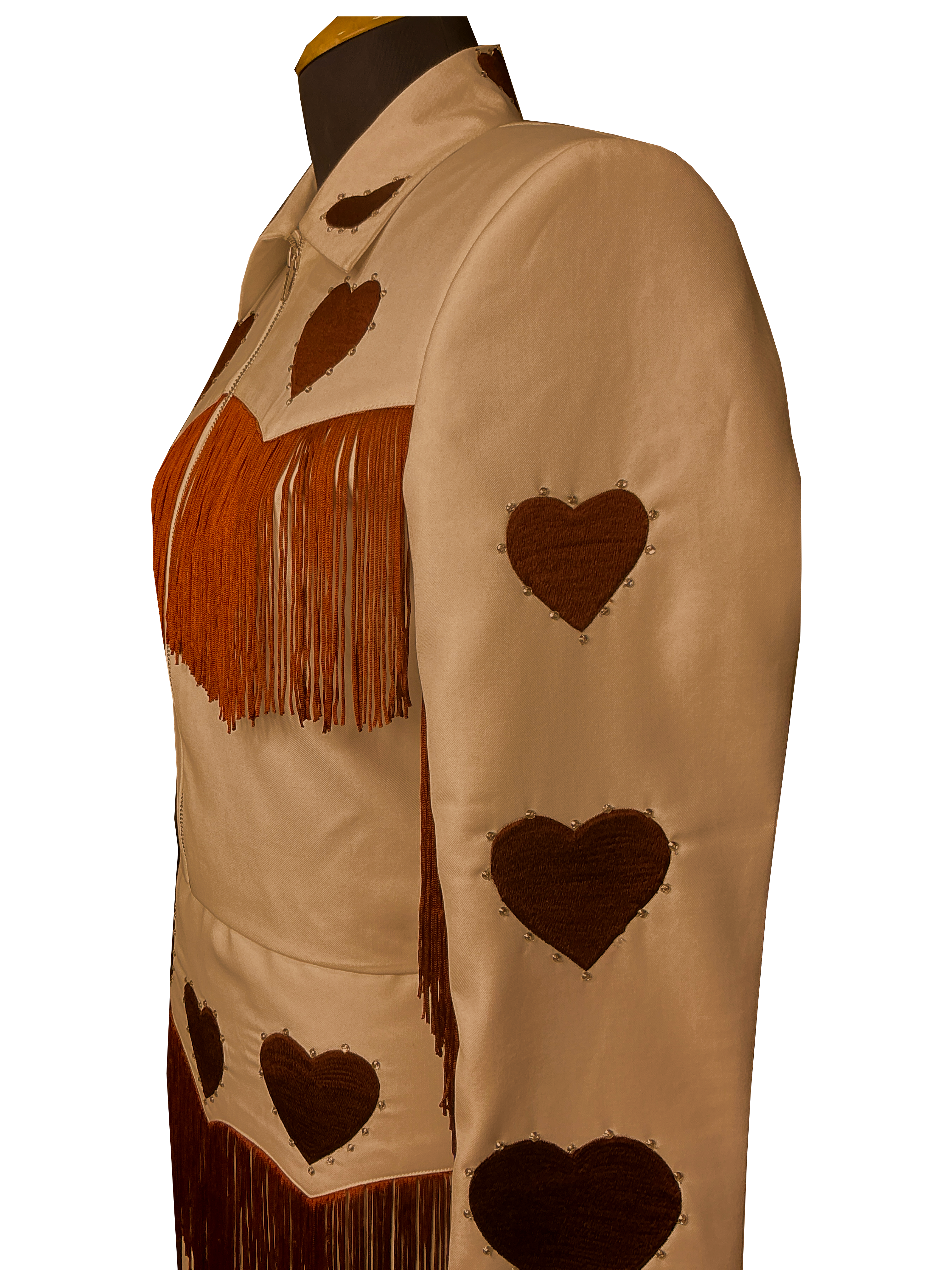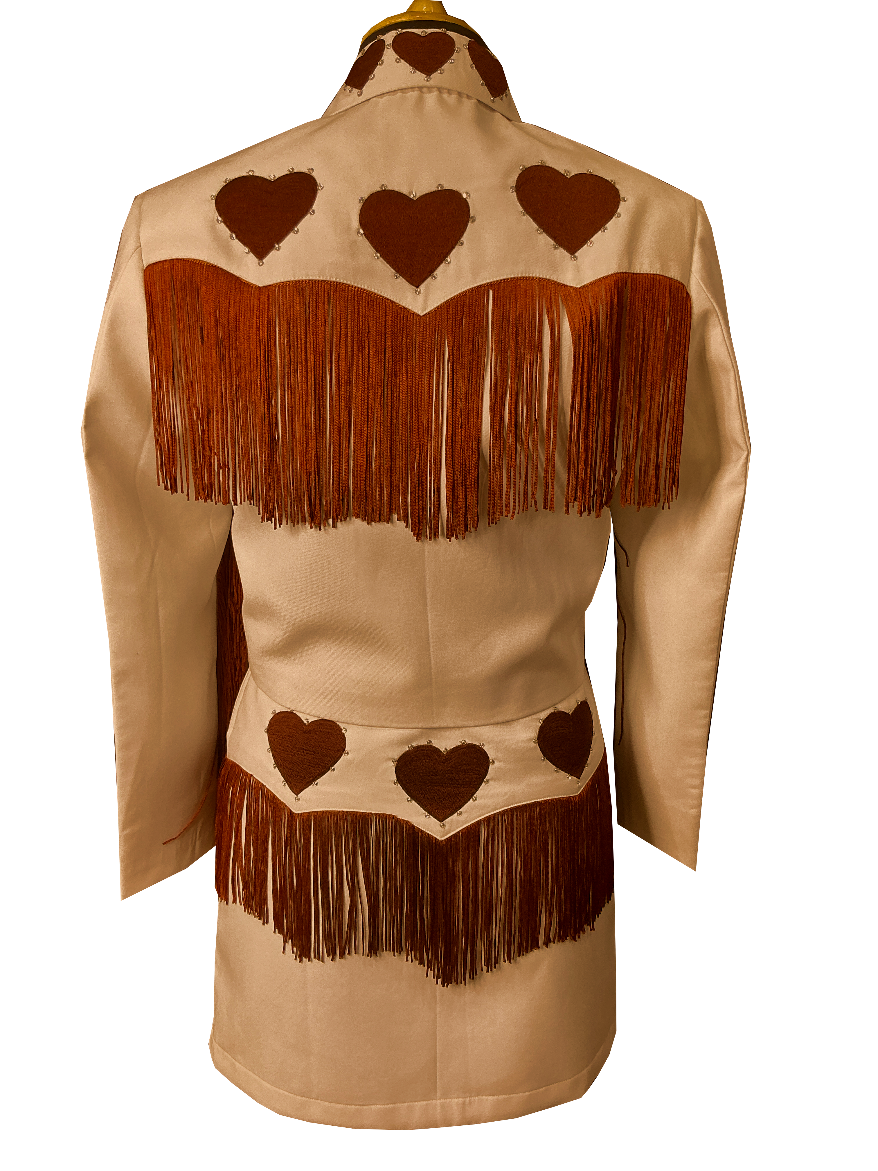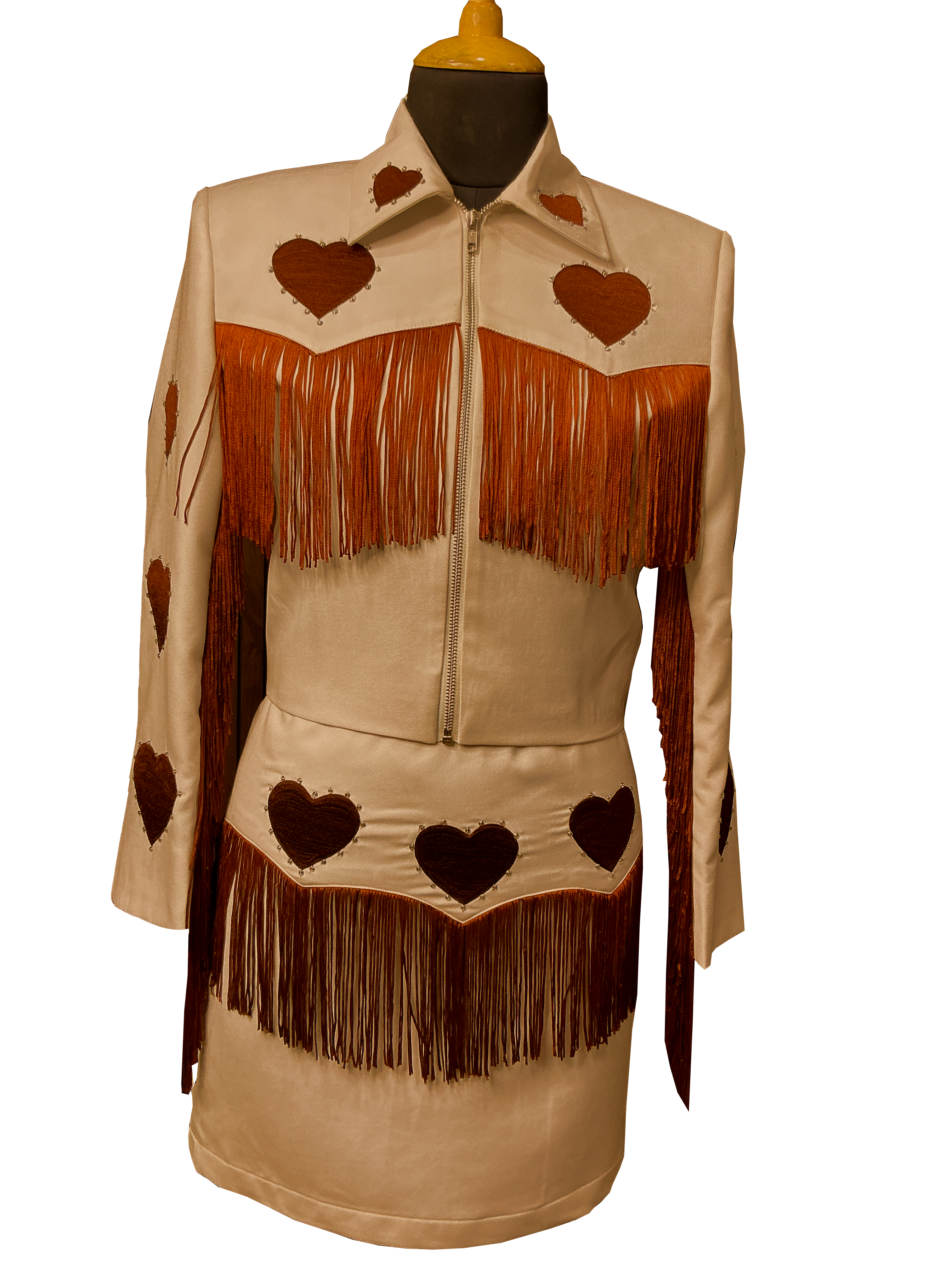The soft beige tone offers a timeless and versatile foundation, while heart-shaped embroidery adds charm, texture, and visual interest. Fringe accents bring dynamic movement and playful Western-inspired flair, creating a feminine yet bold silhouette. Each detail is meticulously crafted, reflecting expert craftsmanship and couture-level finishing.